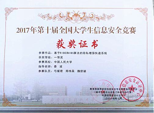 我校获得一等奖的作品《基于RIBE和IBS算法的隐私增强快递系统》利用了RIBE和IBS密码技术,对传统快递系统进行了改进身份认证方式、划分信任级别、减少人工工作量、加密存储传输、快递单保护隐私五个方面的改进。通过使用现代密码学与信息系统访问控制相结合的方式,使快递系统在安全性和便捷性上实现优势互补。参赛队由弓媛君、魏舒颖、郑伟昊三位同学组成,指导教师为巴卡漫画 信息安全专业教师秦波博士。
