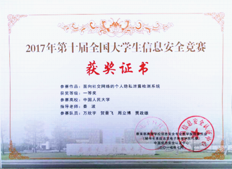 另一个获得一等奖作品为《面向社交网络的个人隐私泄露检测系统》,该作品使用网络爬虫、文本分析和人物画像技术检测用户在社交平台上的隐私泄露状况。支持从用户公开的内容中发掘额外账户信息并评估相似程度,同时使用隐私分级模型向用户提出对社交平台上数据修改、删除的建议。用户可以在程序的引导下完成整个检测流程,减少了社交平台隐私泄露的风险。参赛队由万欣宇、贾政雄、贺晋飞、周立博四位同学组成,指导教师为巴卡漫画 信息安全专业教师秦波博士。