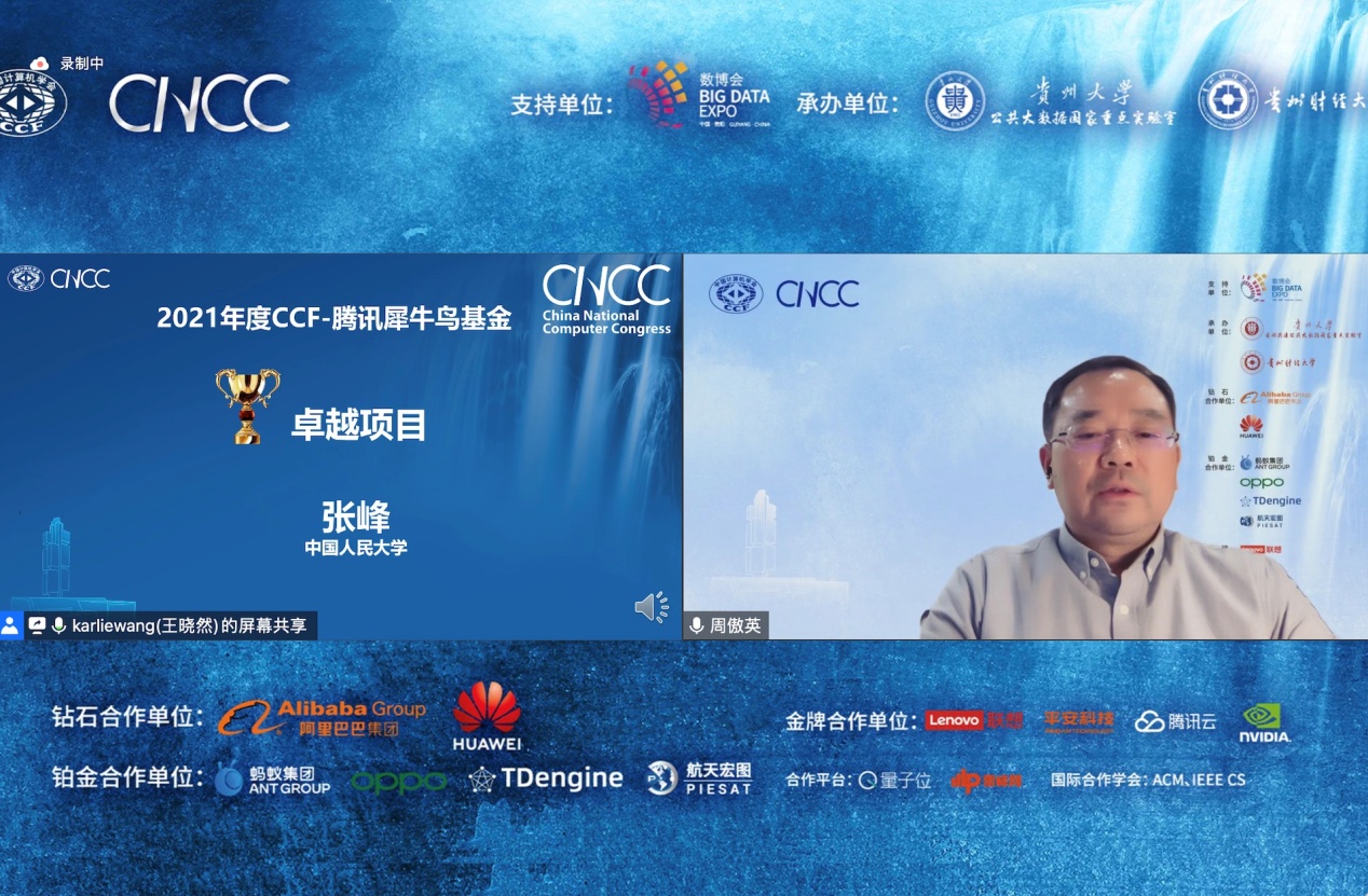 CCF-腾讯犀牛鸟基金由中国计算机学会(简称CCF)和腾讯公司联合发起,旨在助力全球青年学者把握时代赋予的机遇,开展致力于提升人类生活品质的创新研究。2021年度CCF-腾讯犀牛鸟基金评优答辩会有来自清华、北大、复旦、上交、人大等不同研究方向的34位优秀青年学者参与,竞争激烈。华东师范大学周傲英副校长担任评审专家组组长,评出最高奖“CCF-腾讯犀牛鸟基金卓越项目奖”一项,“CCF-腾讯犀牛鸟基金优秀项目奖”八项。张峰副教授由于在项目期间成果突出,得到了与会专家的好评,获得排名第一的好成绩,被授予卓越项目奖。
