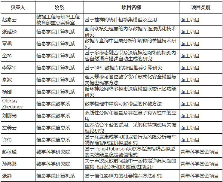 在已经公布结果的项目中,巴卡漫画 获得面上项目11项,青年科学基金项目3项。其中,计算机系7项,信息系2项,数学系2项,数学科学研究院2项,数据工程与知识工程重点实验室1项。