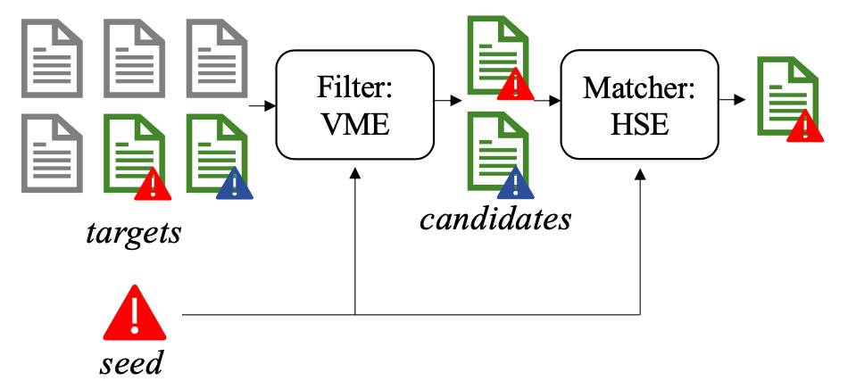 在此文中,提出了一种两阶段策略来加速最优代码图顶点匹配以检测缺陷。在第一阶段,训练了一个面向顶点匹配的嵌入模型VME(Vertex-matching-oriented Embedding Model),并利用该模型从目标代码库中快速过滤有限数量的代码图作为候选,这些候选图可能与种子(即已知的含缺陷的代码片段)具有较高的顶点匹配度。可大大减少需要进一步分析的代码图数量。在第二阶段,建立了一个基于图卷积神经网络的高阶相似性嵌入模型HSE(High-order Similarity Embedding Model),以高效地获取种子图和候选图之间的近似的最优顶点匹配结果,以计算候选图与种子的相似度来识别潜在的含缺陷代码。对比实验表明,论文方法可以有效地缓解噪声问题,所实施的两阶段策略可以将检测效率提升数十倍。论文方法已应用于5个开源项目,共检测到30余个未知缺陷,并得到了开发者的确认。