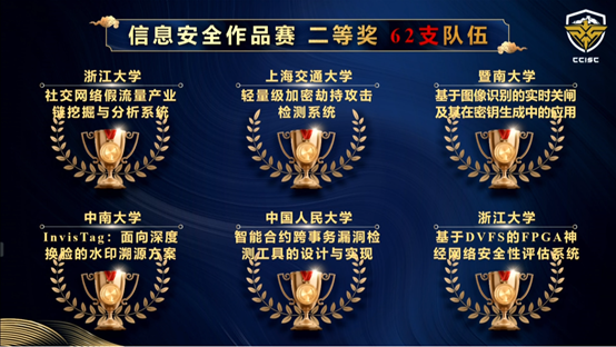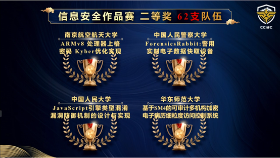 全国大学生信息安全竞赛是一项全国性的比赛。竞赛侧重考查参赛学生的创新能力,内容应既有理论性,也有工程实用性,从而可以全面检验和促进学生的信息安全理论素养和实际动手能力。参赛作品由参赛队自主命题,自主设计,以信息安全技术与应用设计为主要内容,参赛队利用课余时间,在规定时间内完成作品的设计、调试及设计文档,提交大赛专家委员会评议。本次大赛共吸引了来自全国156所高校的718支团队报名参赛,报名人数达2603人,经过初赛选拔,最终来自全国92所院校的305支团队进入本次决赛,经激烈角逐,40支队伍获得一等奖,62支队伍获得二等奖,81支队伍获得三等奖,此外有37位指导老师获得优秀指导教师奖。
