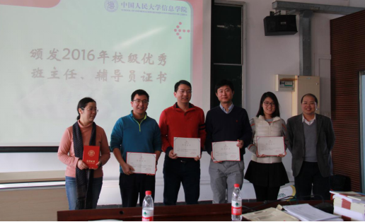 陈红书记介绍2016年校级优秀班主任、优秀专职辅导员获得者。左美云副院长为各位班主任、专职辅导员颁奖。