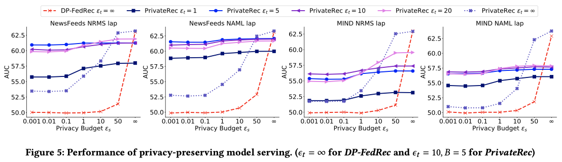 本文基于MIND以及NewsFeeds这两个真实的新闻推荐数据集进行了大量实验与分析,和隐私保护的联邦推荐基线方法相比,PrivateRec可以在隐私保护的前提下提供更好的推荐服务质量,尤其是当隐私预算较小时候提升较为显著。