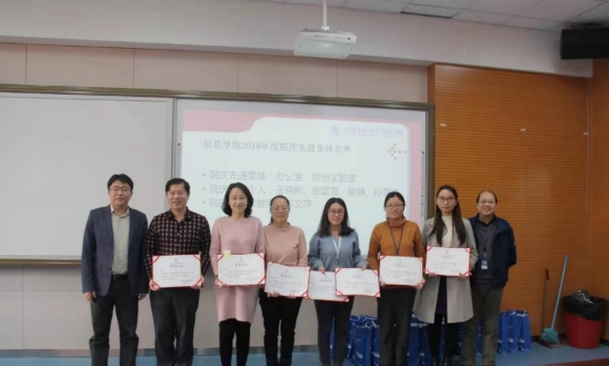 陈红书记介绍2018年度学院教学、科研、社会服务和管理服务先进工作者等。文继荣院长、陈红书记为各位先进工作者颁奖。