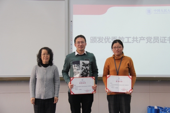 陈红书记介绍2018年优秀教工共产党员获得者王璞巍、孙亚琳,并为两位优秀教工共产党员颁奖。