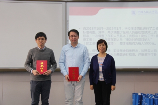 陈红书记介绍2018年校级科研优秀、外事工作先进个人获得者。李翠平副院长为科研优秀先进个人赵鑫、外事工作先进个人杜忠朝颁奖。