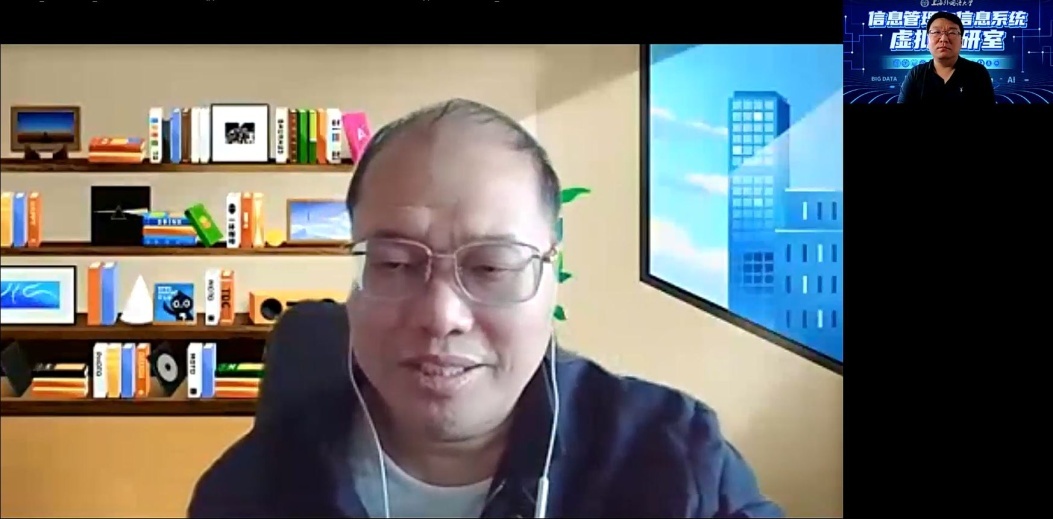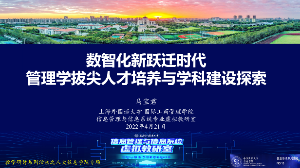 2022年4月21日星期四下午,巴卡漫画 经济信息管理系在理工配楼4层会议室组织“信息系统”双周讲坛的第十三个次讲座“数智化新跃迁背景下的管理学拔尖人才培养与专业建设探索”,线上同步进行。本次讲座由上海外国语大学国际工商管理学院副院长、信管专业虚拟教研室负责人马宝君教授在线主讲,信息系程絮森教授主持,包括信息系左美云教授、许伟教授、蒋洪迅副教授、余艳副教授、孙彩虹副教授、周季蕾师资博士后在内的110多位老师同学通过线上线下形式听取了讲座,讨论交流气氛热烈。