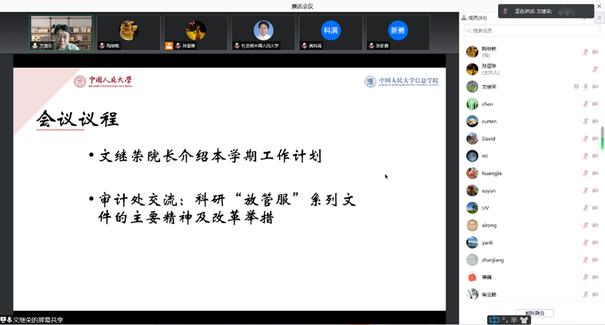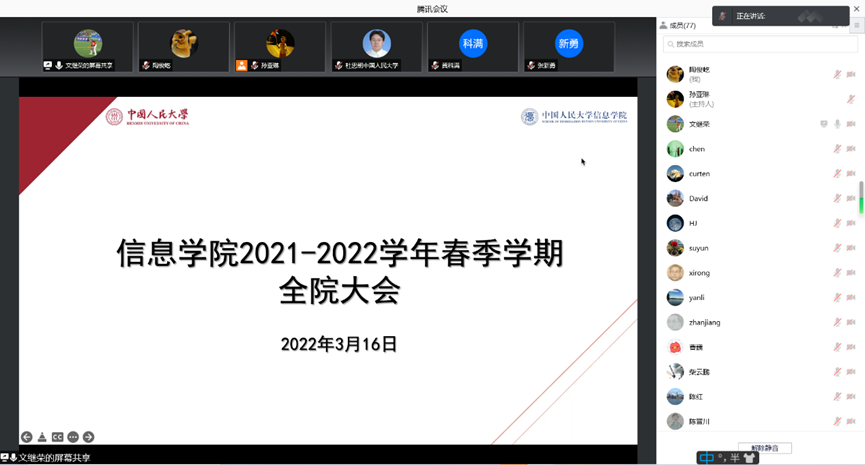 文继荣院长首先介绍了2022年春季学期工作计划和安排,结合新学期工作要点,从学科发展、本科人才培养、研究生培养、科学研究、国际交流、对外合作、队伍建设、实验室工作、党团学建设九个方面全方位的介绍了本学期学院的总体安排,提出了未来工作思路,让老师们对学院接下来的发展有了更具体的认识。