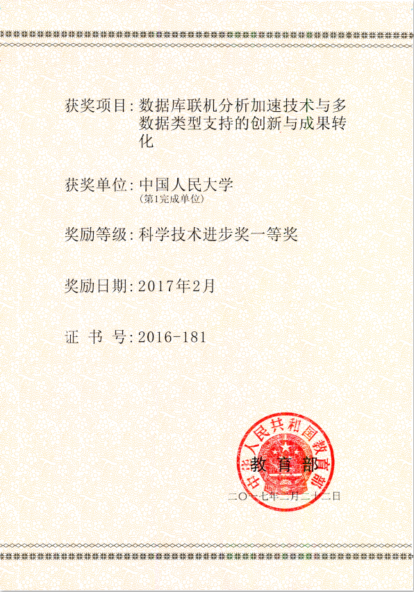 2016年,学院杜小勇、陈红、张孝、张延松、李翠平、陆嘉恒、王珊申报的《数据库联机分析加速技术与多数据类型支持的创新与成果转化》成果,获评教育部科技进步一等奖。