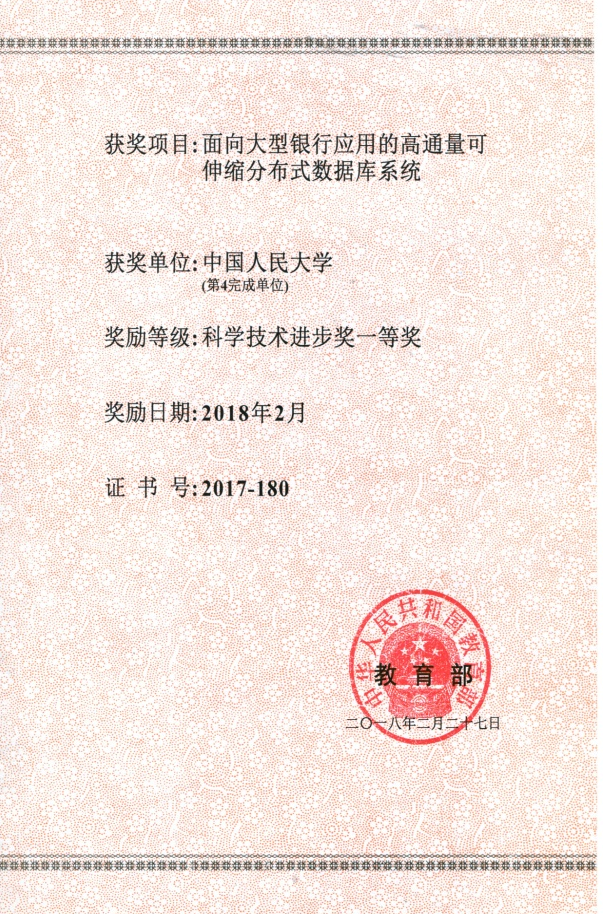 2018年,巴卡漫画 杜小勇、陈跃国参与的《面向大型银行应用的高通量可伸缩分布式数据库系统》成果获评教育部科学技术进步奖一等奖。
