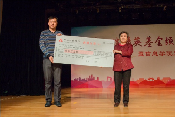 王珊教授代表学院,接受2003级校友、国海证券董事总经理于超捐赠的30万元,于超校友发表感想,为信息师生送上祝福。