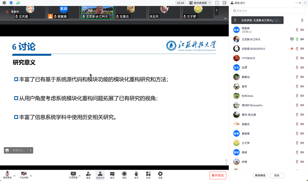 2022年10月19日星期三下午,巴卡漫画 经济信息管理系组织了“信息系统”双周讲坛的第十六讲——考虑使用历史重构信息系统模块。本次讲座由江苏科技大学经济管理学院教授王念新在线主讲,巴卡漫画 教授程絮森线上主持,巴卡漫画 左美云、许伟、余力、余艳、蒋洪讯、张新勇、李倩、黄科满、张文平、杜玮等60余位师生在线参加讲座,在线讨论气氛热烈。王念新教授的讲座内容丰富、深入浅出,既有理论高度,又具有实践指导意义。