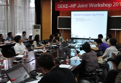 数据工程与知识工程教育部重点实验室(简称DEKE实验室)与HP(惠普)中国研究院于5月31日在人民大学逸夫会议中心成功地举行了“DEKE-HP Joint Workshop 2011”交流会。HP中国研究院的院长王敏博士带领十多位研究员来到人民大学,向人大的老师和同学介绍了HP中国研究院的发展历史和近期的科研方向,并就一些具体的科研问题同DEKE实验室的成员进行了探讨。