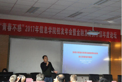 学院92级校友、国家信息中心总工刘增明进行了“大数据在智慧金融领域的应用”主旨演讲。他表示,金融领域将不断增进人工智能、区块链、大数据和云计算的应用,从而助力智慧城市建设。通过对比社会发展情况,详细阐述了把握时代趋势、数据共享、政府数据脱密,以形成数据1+1>2的新模式。