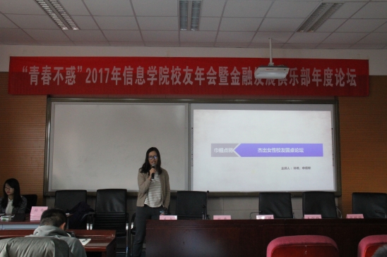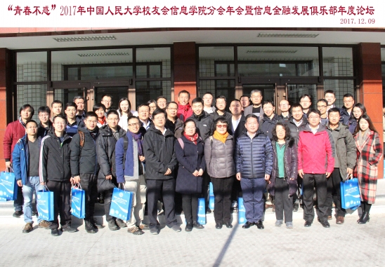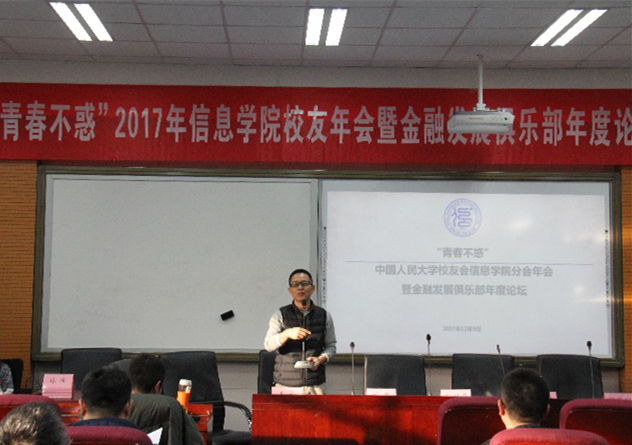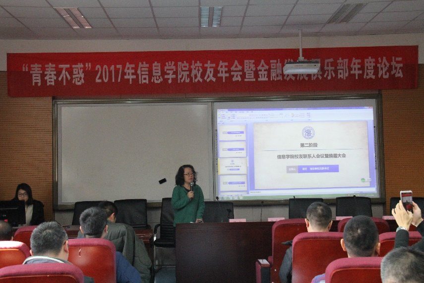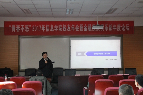 2017年12月9日,“青春不惑”2017年巴卡漫画 校友会巴卡漫画 分会年会暨信息金融发展俱乐部年度论坛在信息楼四层报告厅顺利召开。我校校友工作办公室主任郭海鹰,理工处处长、巴卡漫画 前院长杜小勇,学院党委书记陈红,院长文继荣,党委副书记张国富等出席会议;巴卡漫画 校友78级殷正栋、79级成晓梅、84级陈建良、85级王琮等近80位历届校友参加此次年会。
